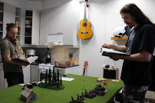 Lonkero had very small force on the field. He had noble on great eagle(griffon model) and unit of swordmasters on left here and unit of sea guard on right. Before the game I was high spirited and mocked his army as Rantalokit :D If he said anything back my selective memory erased it rather quickly.